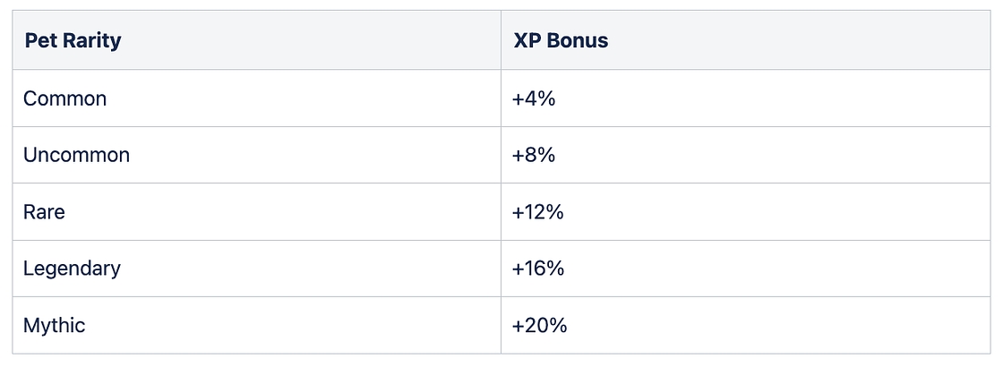 Every Pet, when bonded and fed, provides a static bonus to the experience gained by the Hero while questing. Unlike the Gathering Profession Bonus, this XP Bonus applies to all quests that the Hero performs.